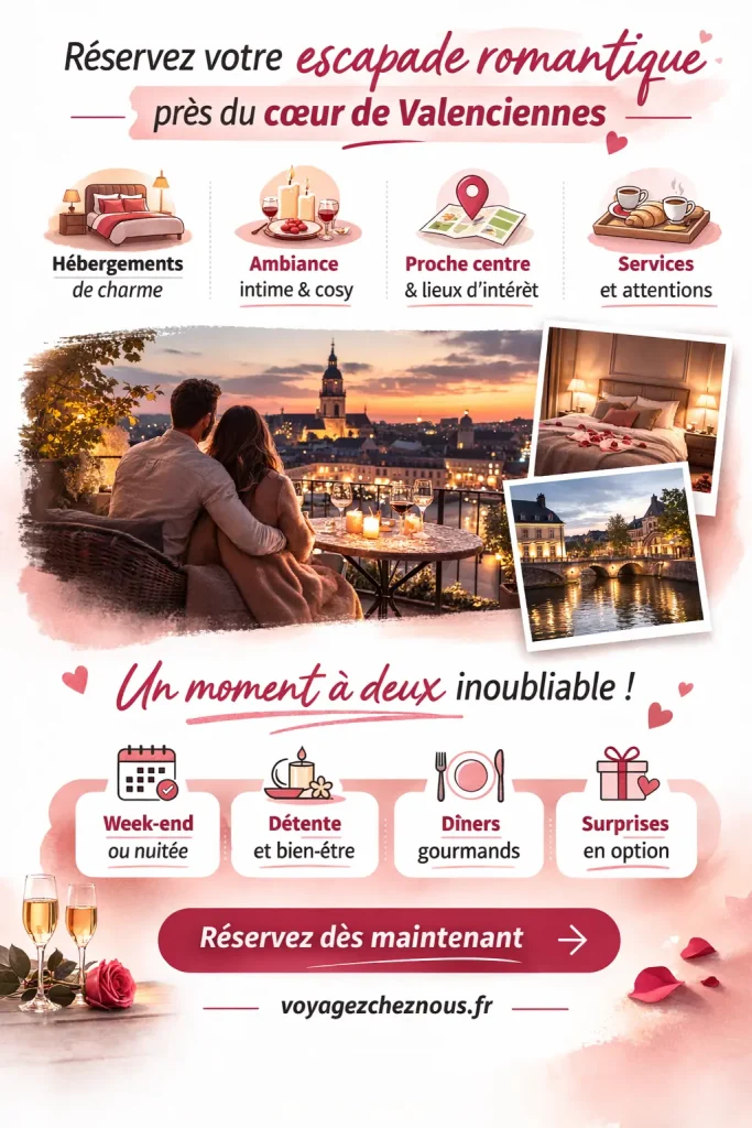 Anecdote perso : La dernière fois que j’ai fait une mini-escapade “proche mais dépaysante”, j’avais juste prévu une nuit… et au final on a prolongé parce qu’on s’est laissé happer par le rythme : balade tranquille, petite adresse gourmande, puis retour à l’hébergement sans courir. Ça m’a rappelé un truc simple : sur un week-end romantique, ce n’est pas la distance qui compte, c’est l’enchaînement des micro-moments. Valenciennes, c’est exactement ce genre de vibe.