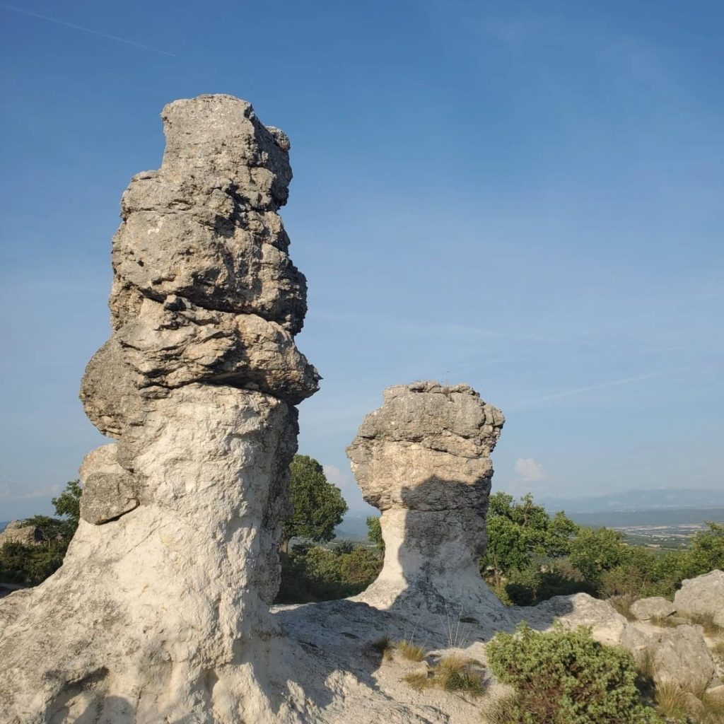 Le site des Mourres se distingue par un paysage spectaculaire, marqué par une histoire géologique fascinante. Ces formations singulières résultent de la présence de roches calcaire modelées par l’érosion au fil de millions d’années, créant un site naturel d’exception. Le terme « Mourre » désigne en provençal une figure, un visage ou un mufle, en référence aux formes humaines et animales que la nature a sculptées dans la pierre.
